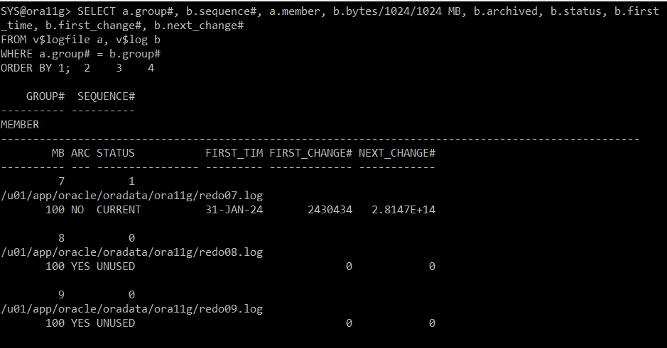 SELECT a.group#, b.sequence#, a.member, b.bytes/1024/1024 MB, b.archived, b.status, b.first_time, b.first_change#, b.next_change#