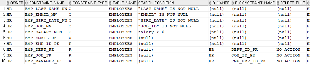 - 제약조건 정보 확인. SELECT * FROM user_constraints WHERE table_name in ('EMP', 'DEPT'); SELECT * FROM user_cons_columns WHERE table_name in ('EMP', 'DEPT'); - 제약조건 삭제 방법1) ALTER TABLE hr.emp DROP CONSTRAINT emp_id_pk; 방법2) ALTER TABLE hr.emp DROP PRIMARY KEY; # dept 테이블의 pk # 오류발생 : 나를 참조하고 있는 foreign key 제약조건이 존재하기 때문이다. ORA-02273: this unique/primary key is referenced by some foreign keys ALTER TABL..